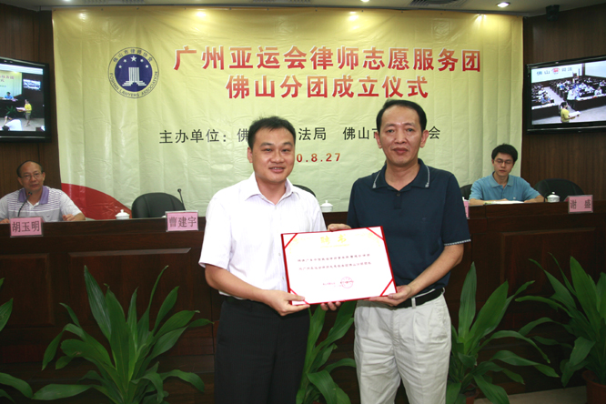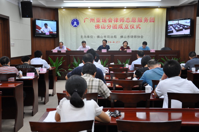 今年11月12日,第16届亚洲运动会将于广州举办,其中花样游泳和拳击将在我市举行。为积极贯彻省委、省政府关于办好广州亚运会的指示精神,充分发挥律师职能作用,佛山市司法局、佛山市律师协会在省司法厅与亚组委组建的“广州亚运律师志愿服务团”基础上,成立“广州亚运律师志愿服务团佛山分团”,该团的主要职能是为广州亚运会提供专业的法律服务,参与化解矛盾纠纷。8月27日下午,“广州亚运会律师志愿服务团佛山分团”成立仪式在市司法局九楼会议室隆重举行,广州亚组委办公室法律事务处处长黎丽红、市司法局副调研员张庆林、我会副会长曹建宇、秘书长胡玉明以及市青年志愿者协会秘书长谢盛等出席了仪式。 “广州亚运律师志愿服务团佛山分团”由担任“广州亚运律师志愿服务团”成员的我会10名律师以及另在全市选拨的6名律师共16人组成,由我会副会长、中信致诚律师事务所律师曹建宇担任团长、南天明律师事务所律师纪建斌、至高律师事务所律师韩丽茹担任副团长。亚运期间,佛山分团的律师们将免费为广州亚组委和广州亚运会佛山赛区参赛的运动员、教练员、裁判员提供法律咨询、参与纠纷调解等法律服务,维护亚组委及广州亚运会佛山赛区参赛人员和相关人员的合法权益,预防和化解各种矛盾纠纷,确保亚运会顺利进行。