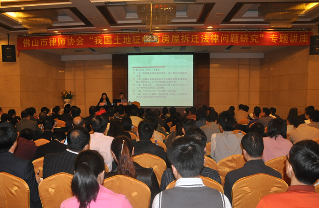 华南理工大学法学院教授、博士,广东省法学会房地产法研究会副会长、中国行政管理学会政策科学研究会常务理事、中国法学会经济法学研究会理事刘国臻主讲,刘国臻教授以其多年的研究理论和法律实践,从土地征收、房屋拆迁以及三旧改造的法律问题、土地征收的法定条件、土地发展权三大方面进行了深入浅出的讲解。讲座完后,刘教授还与我会律师就相关法律问题和案例进行了互动交流,现场气氛热烈,律师踊跃提问,参加讲座的律师无不感到受益匪浅、意犹未尽。