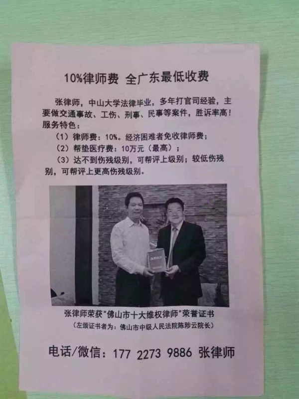 近日,一张“10%律师费 全广东最低收费”的宣传单张微信上流传,该宣传单张上一名自称“张律师”的人,微信及电话号码为:17722739886,称其是中山大学法律毕业,多年打官司经验,主要做交通事故、工伤、刑事、民事案件,胜诉率高。服务特色是律师费收10%,经济困难者免收律师费;帮垫医疗费最高10万元;达不到伤残级别,可帮评上级别,较低伤残级别,可帮评上更高伤残级别。其还自称荣获“佛山市十大维权律师”荣誉证书,配图为佛山市中级人民法院陈陟云院长为其颁发荣誉证书。