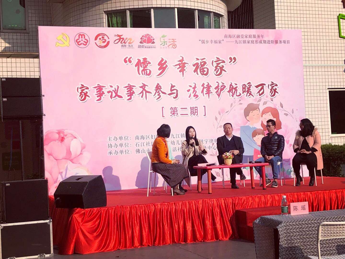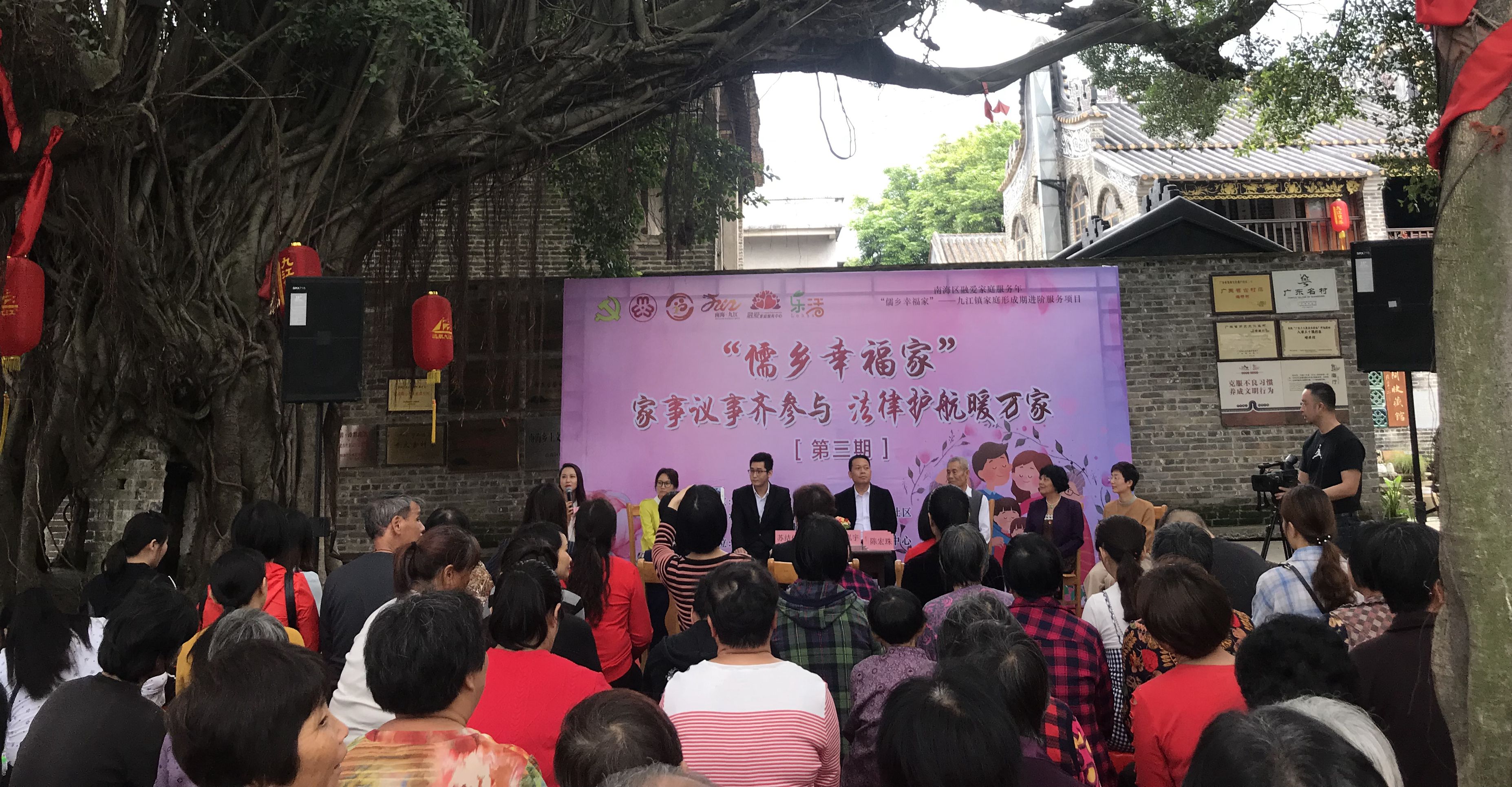 “儒乡幸福家”活动由南海区妇联和九江镇妇联主办,其宗旨为:以家事为导向、以传统文化为支撑、以议事厅为载体、用法律保驾护航,从原生家庭中寻根,在新生家庭中修复,为广大夫妇融和家庭生活出谋划策,营造人人参与基层治理的良好氛围。