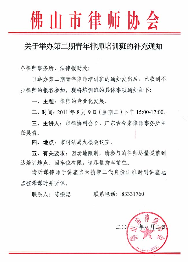 关于举办第二期青年律师培训班的补充通知